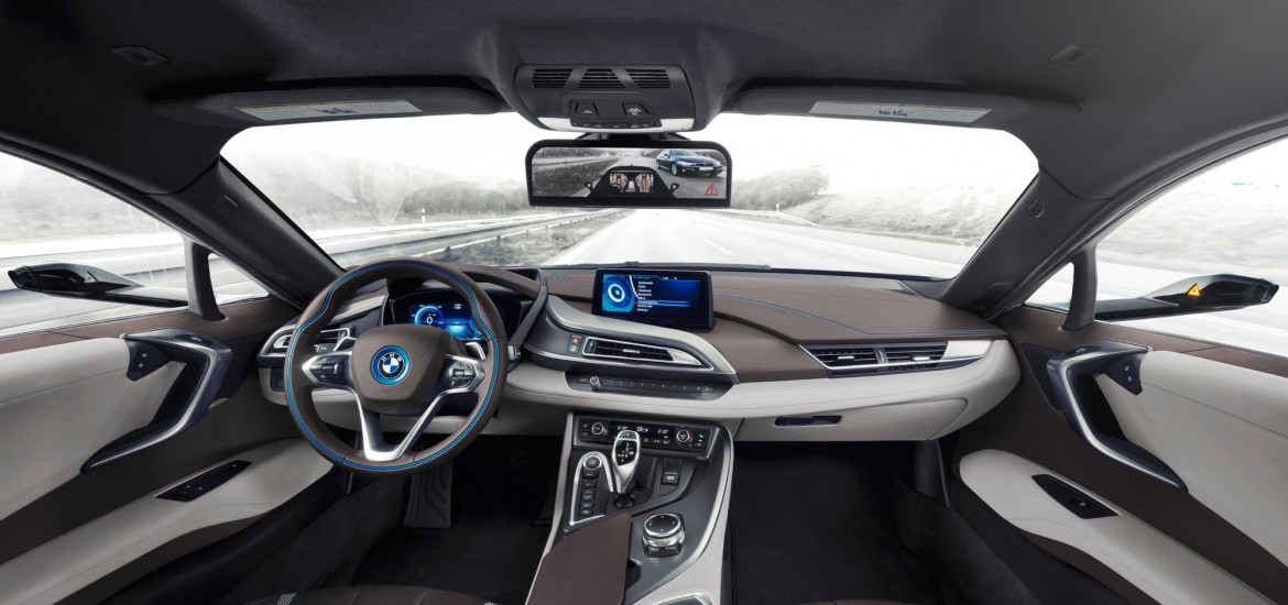Para evitar estos inconvenientes y dar un paso más en cuanto a seguridad, BMW ha dotado a su i8 con la última tecnología en este sentido instalándole tres cámaras: una a cada lado y otra central, en la parte trasera superior, cubriendo todos los ángulos y relegando los ángulos muertos al pasado. Están recubiertas de un cristal llamado “Gorilla Glass” el cual está más que probado en las pantallas de los iPhone, por ejemplo, y no requieren mantenimiento ya que son resistentes a la suciedad y al calor. Las imágenes aparecen en lo que sería el retrovisor central, el cual ha sido sustituido por un monitor de 300 mm de ancho y 75 mm de alto, más grande que un retrovisor al uso pero mucho más elegante debido a sus formas.