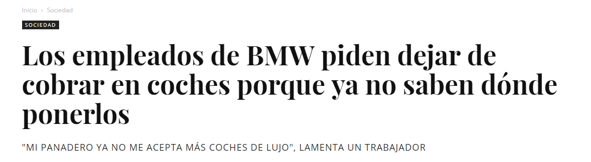En este caso la noticia humorística nos cuenta que los empleados de BMW, que en esta versión paralela del universo, cobran su sueldo en coches, tienen problemas hasta para comprar el pan, porque ya no pueden seguir pagando en especie.