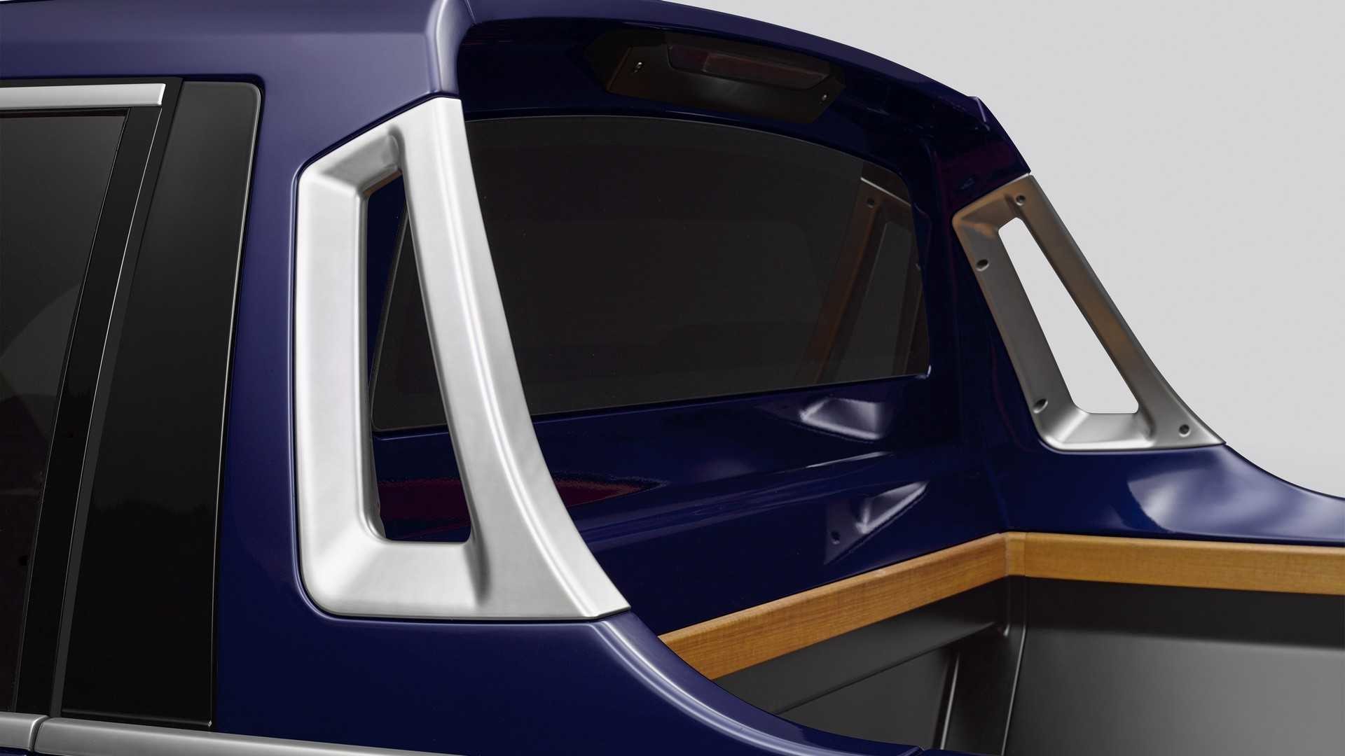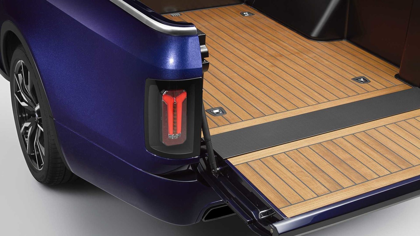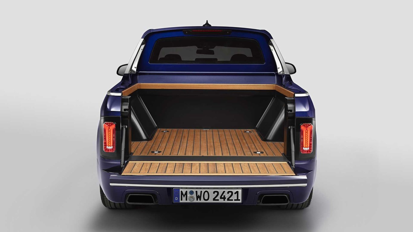 La zona de carga de este BMW X7 tan peculiar, cuya longitud varía entre los 1,4 metros con la portezuela cerrada y los 2,0 metros con ella abierta, se ha fabricado a mano y está recubierta de madera de teca. Para la ocasión, además, esta transformación a la que cuesta acostumbrarse, incluye una moto BMW F 850 GS montada en el cajón.