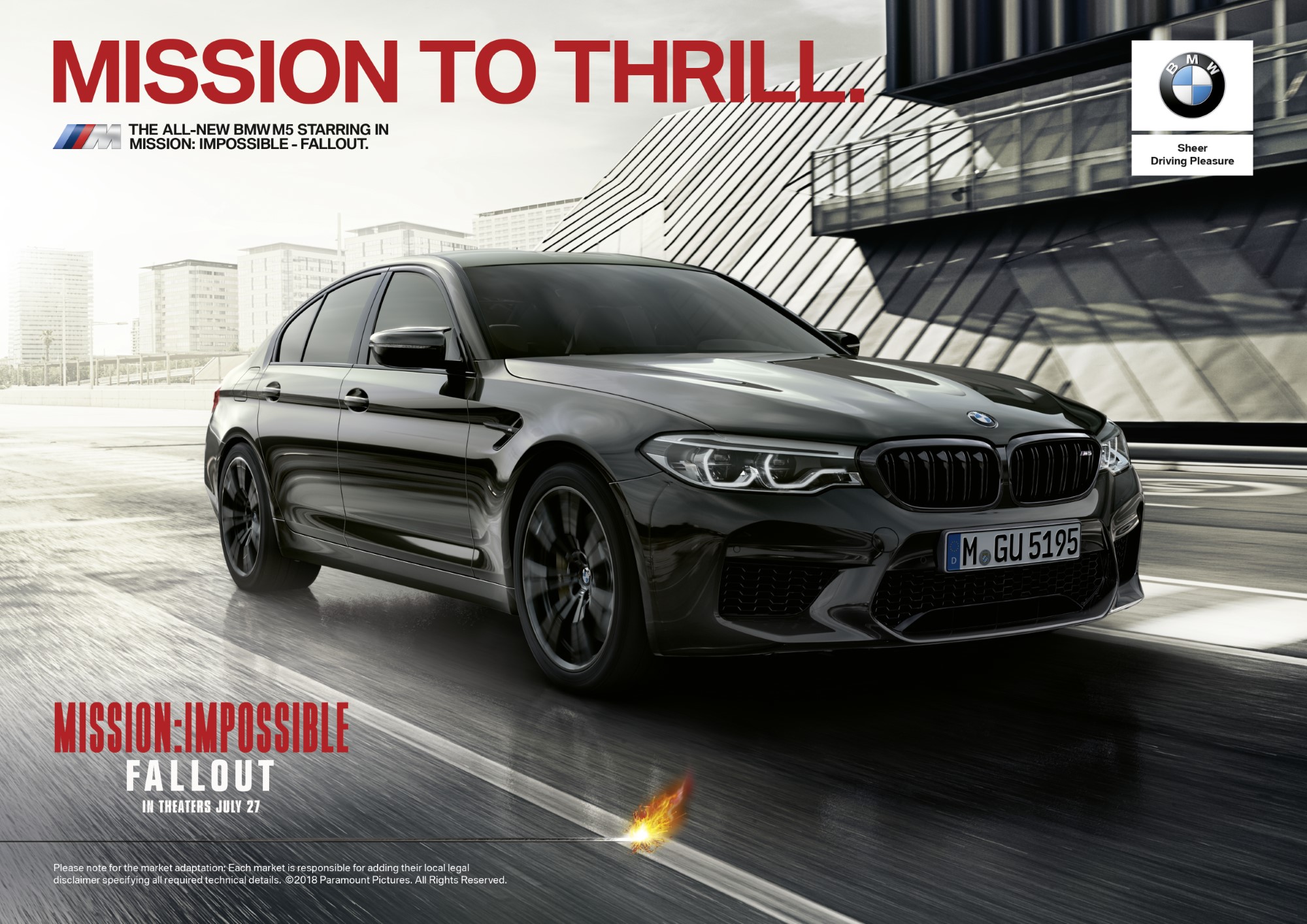 Equipado con Accesorios BMW M Performance, como las cubiertas de retrovisores de fibra de carbono, el BMW M5 se exhibe de modo impresionante en la película. Con su potente motor V8 biturbo de 4,4 litros con tecnología BMW TwinPower Turbo y 441 kW/600 CV y la nueva tracción a las cuatro ruedas M xDrive de alto rendimiento, el BMW M5 se asegura de que Ethan Hunt disponga siempre de la máxima motricidad y dinamismo para poder escapar de sus enemigos.